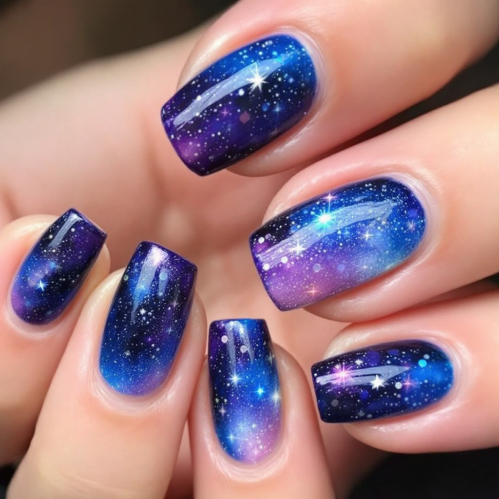 Тренд на космос на ногтях особенно понравится тем, кто хочет поэкспериментировать с текстурами и цветами на коротких ногтях. «Космический» маникюр можно делать в разных вариациях: от темных глубоких оттенков до ярких акцентов.