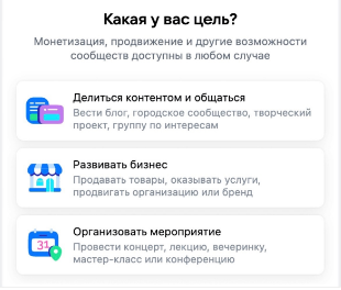 - Продавать товары/услуги или продвигать свой бизнес, выбирайте “Развивать бизнес”