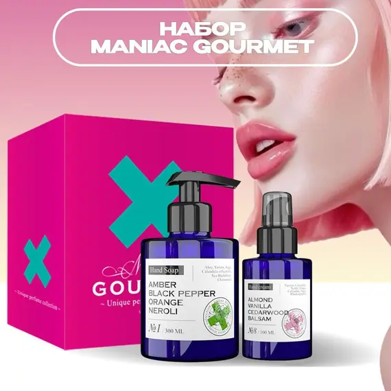 Набор Maniac Gourmet (Мыло жидкое парфюмированное №2 Табак, Кардамон, Амбра, Черный перец + Крем для рук парфюмированный №4 Амбра, Сандал, Пачули, Ваниль)