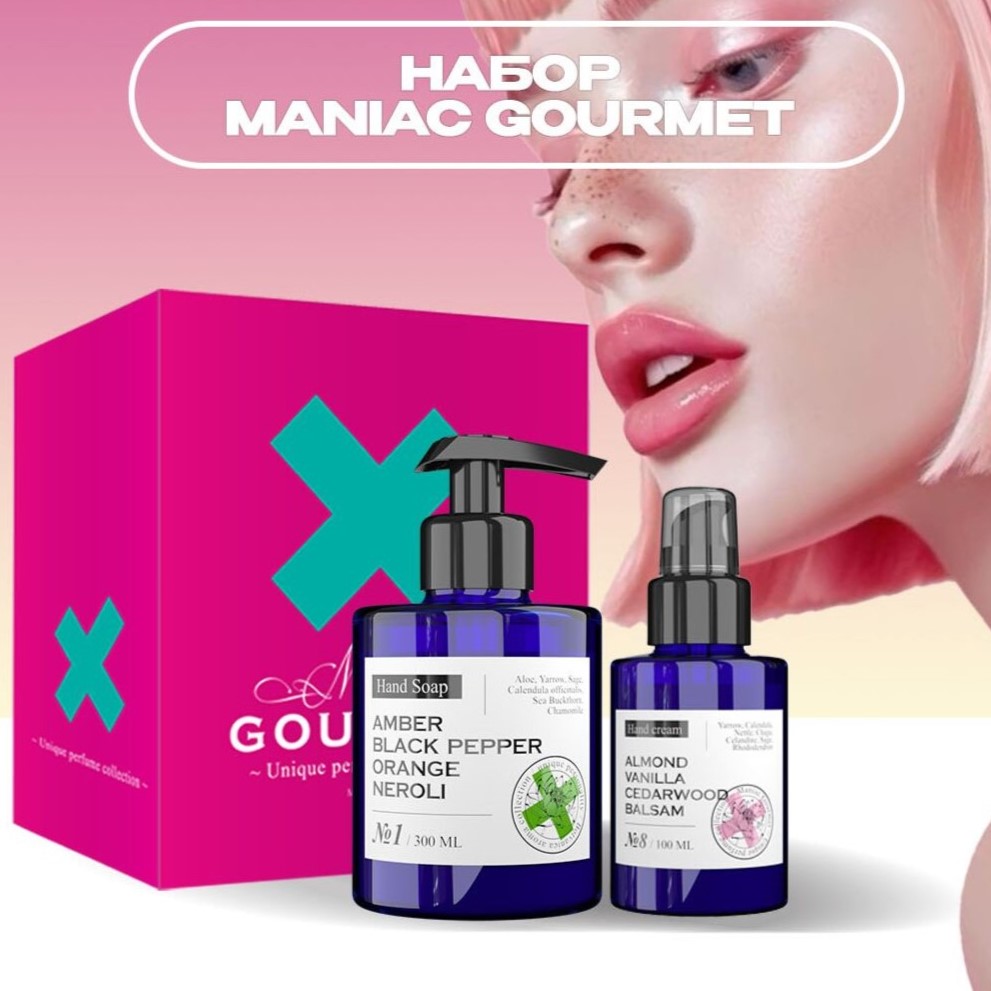 Набор Maniac Gourmet (Мыло жидкое парфюмированное №8 Миндаль, Ваниль, Кедр, Бальзам + Крем для рук парфюмированный №3 Ваниль, Кожа, Амбра, Мускус)