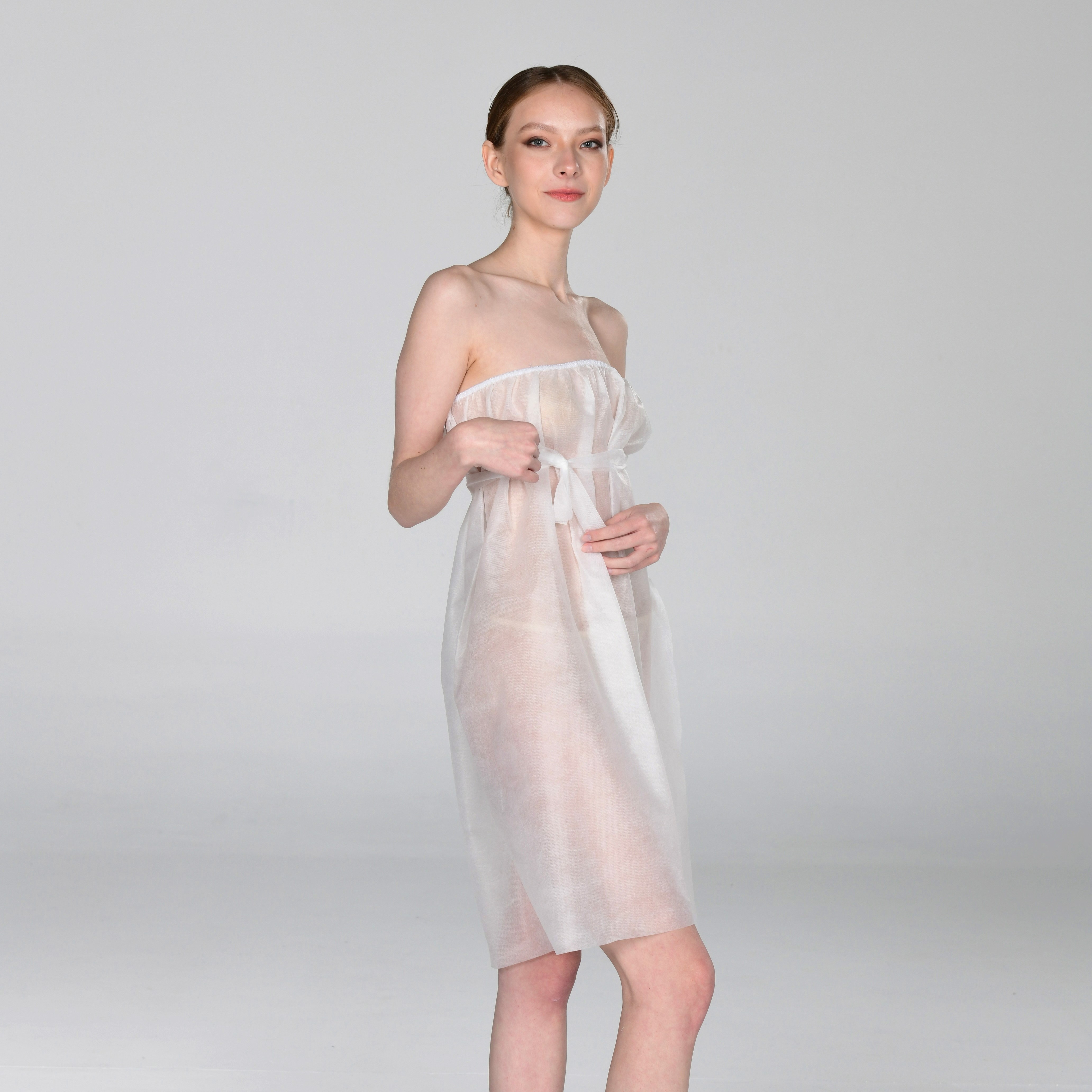 Одноразовые пеньюары на резинке из мягкого материала. Защищают нижнее белье от косметических средств и обеспечивают дополнительный комфорт. Особенно подходят для процедур в области декольте.