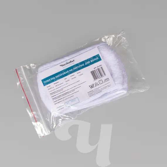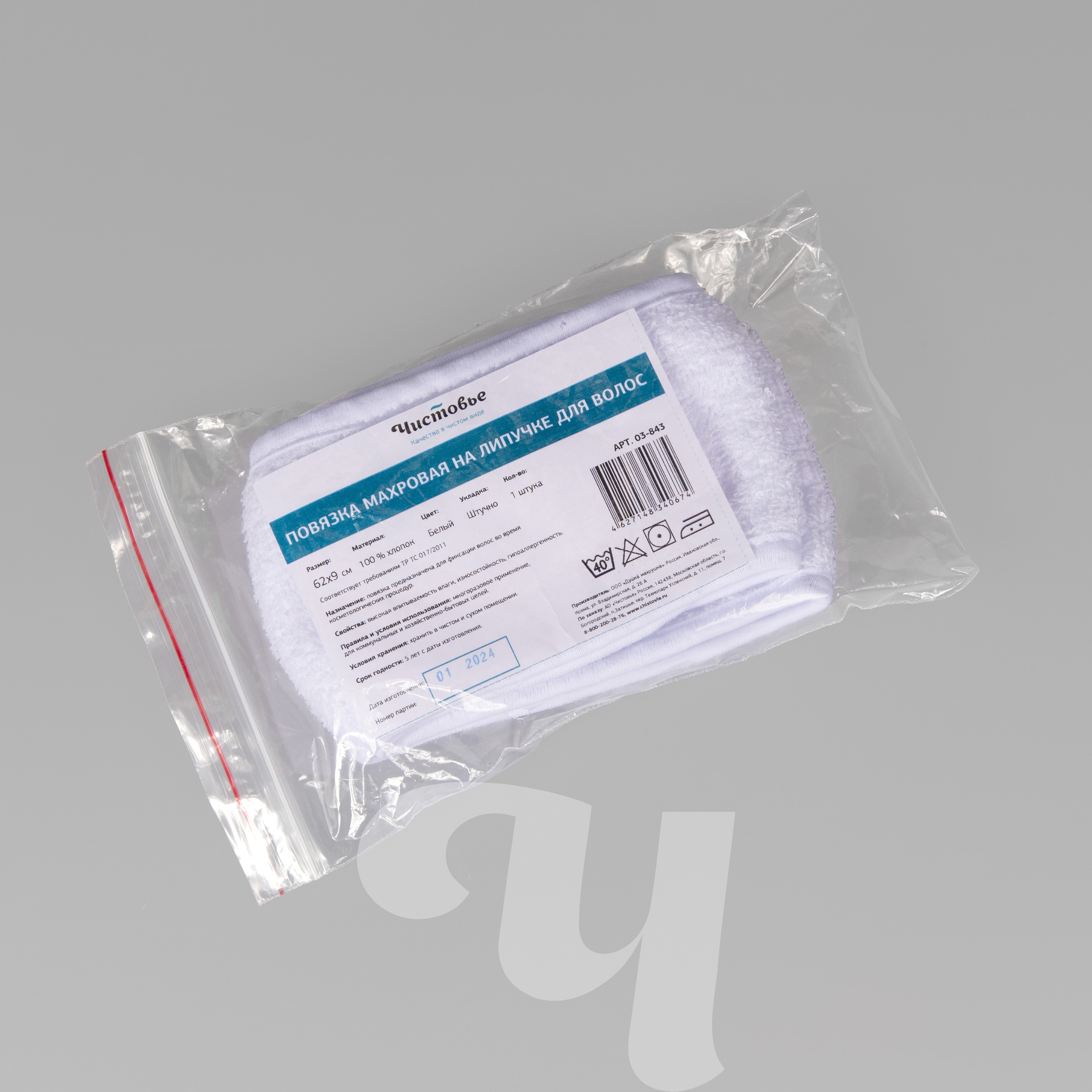 Повязка для волос махровая на липучке белая (9х62), 1 шт