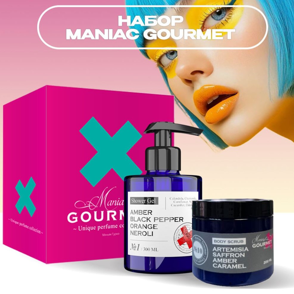 Набор Maniac Gourmet (Гель для душа парфюмированный №8 Миндаль, Ваниль, Кедр, Бальзам + Гель-скраб парфюмированный №5 Апельсин, Черная ваниль, Жасмин, Табак)