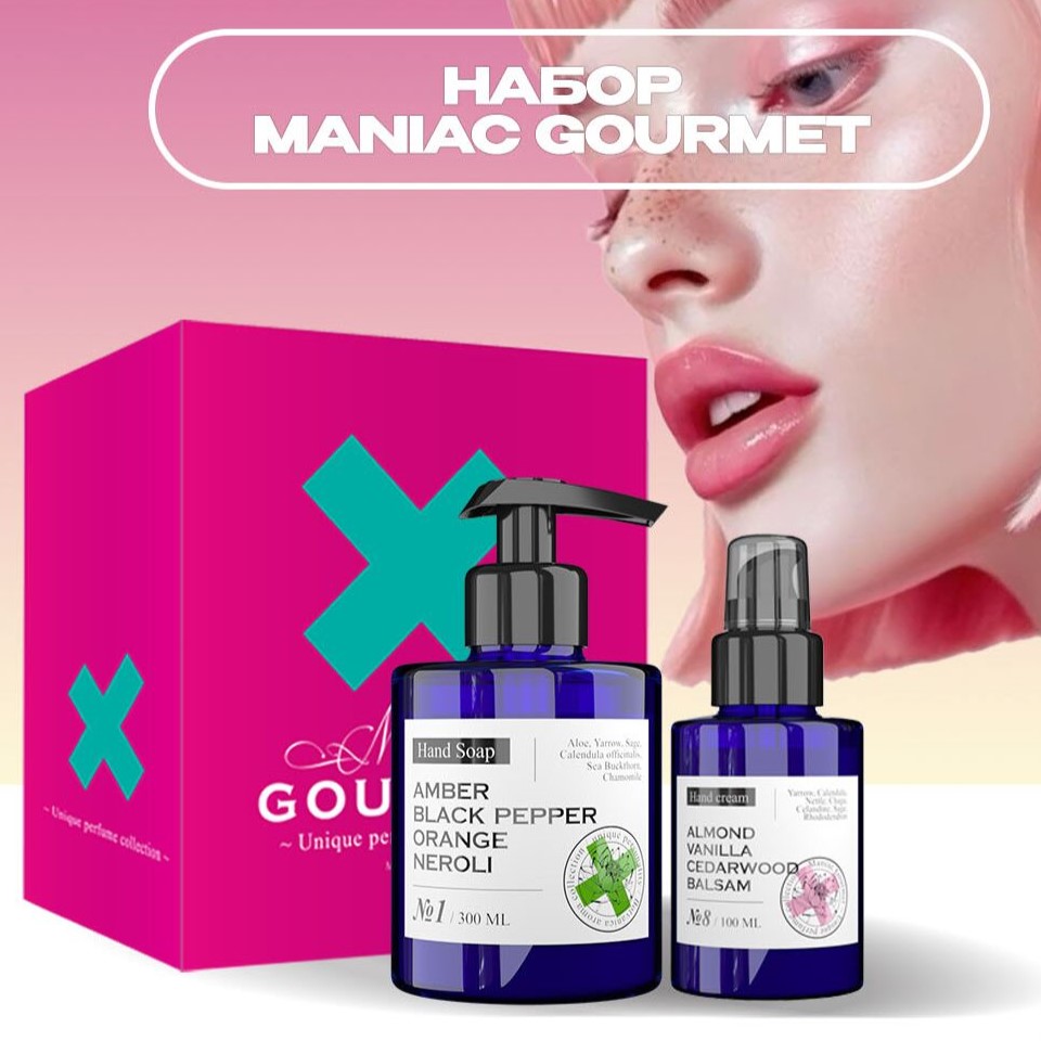 Набор Maniac Gourmet (Мыло жидкое парфюмированное №9 Морская вода, Сливочный сандал, Ветивер, Амбра + Крем для рук парфюмированный №5 Апельсин, Черная ваниль, Жасмин, Табак)