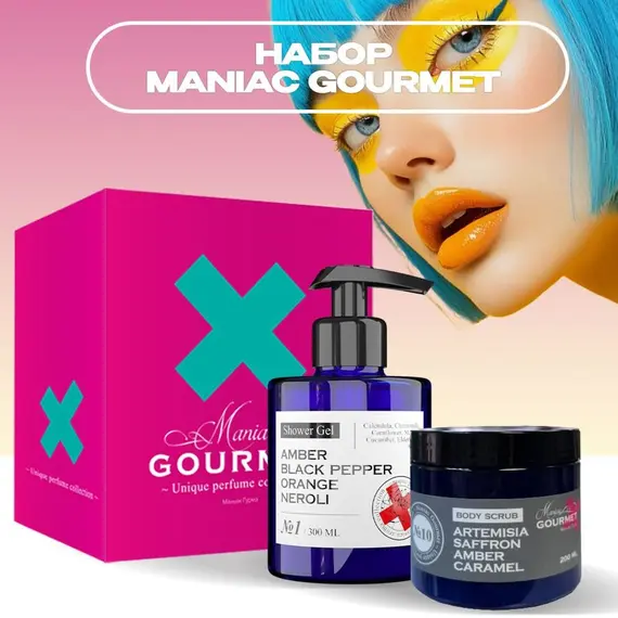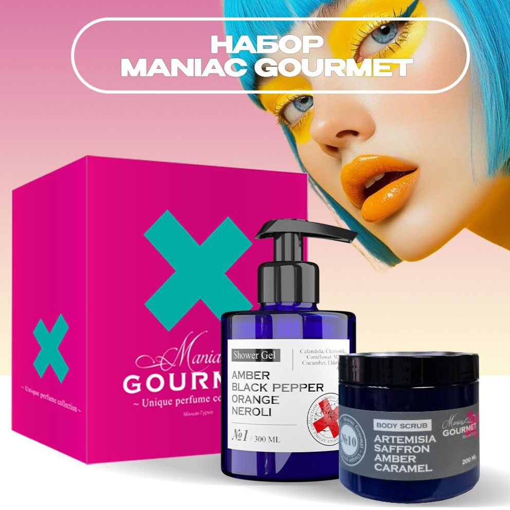 Набор Maniac Gourmet (Гель для душа парфюмированный №6 Вишня, Миндаль, Древесная кора, Мускус + Гель-скраб парфюмированный №10 Полынь, Шафран, Амбра, Карамель)