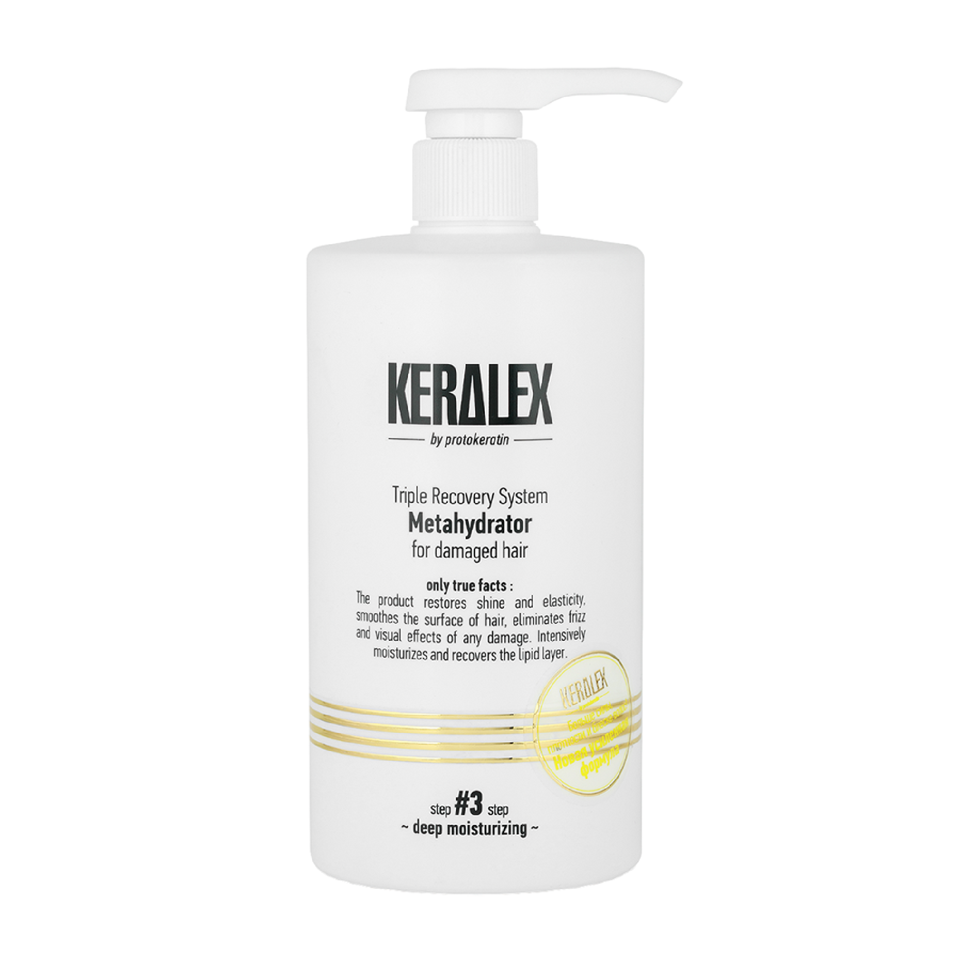Увлажнитель интенсивный для волос Keralex Metahydrator, 750 мл . Восстанавливает блеск и эластичность, нивелирует эффект любых повреждений, обеспечивает стойкий результат разглаживания поверхности волос и снимает статику. Максимально увлажняет, питает, восстанавливает гидролипидный слой. Формирует барьер для защиты от любых воздействий – механических, термических и негативного влияния окружающей среды. В синергии с домашним уходом Double Nutrient Shampoo, Double Nutrient Balsam и Shock Protection, включающих в себя активные инновационные комплексы, обеспечивает пролонгированный эффект реконструкции и восстановления – не менее 25 процедур мытья волос.