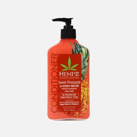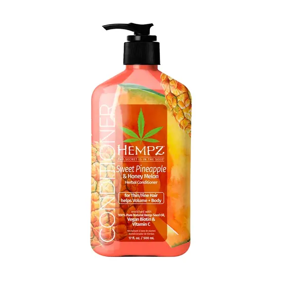 Кондиционер для волос Hempz -уплотняет и смягчает сухие тонкие волосы. Формула с растительным биотином и витамином С уменьшает ломкость волос, предупреждает появление сеченых кончиков и укрепляет стержень волоса. Без сульфатов и парабенов, без фталатов, сохраняет цвет окрашенных волос. Активные ингредиенты: масло семян конопли, экстракт ананаса, экстракт дыни, масло карите, масло жожоба, масло семян подсолнечника, витаминный комплекс А-С-Е.