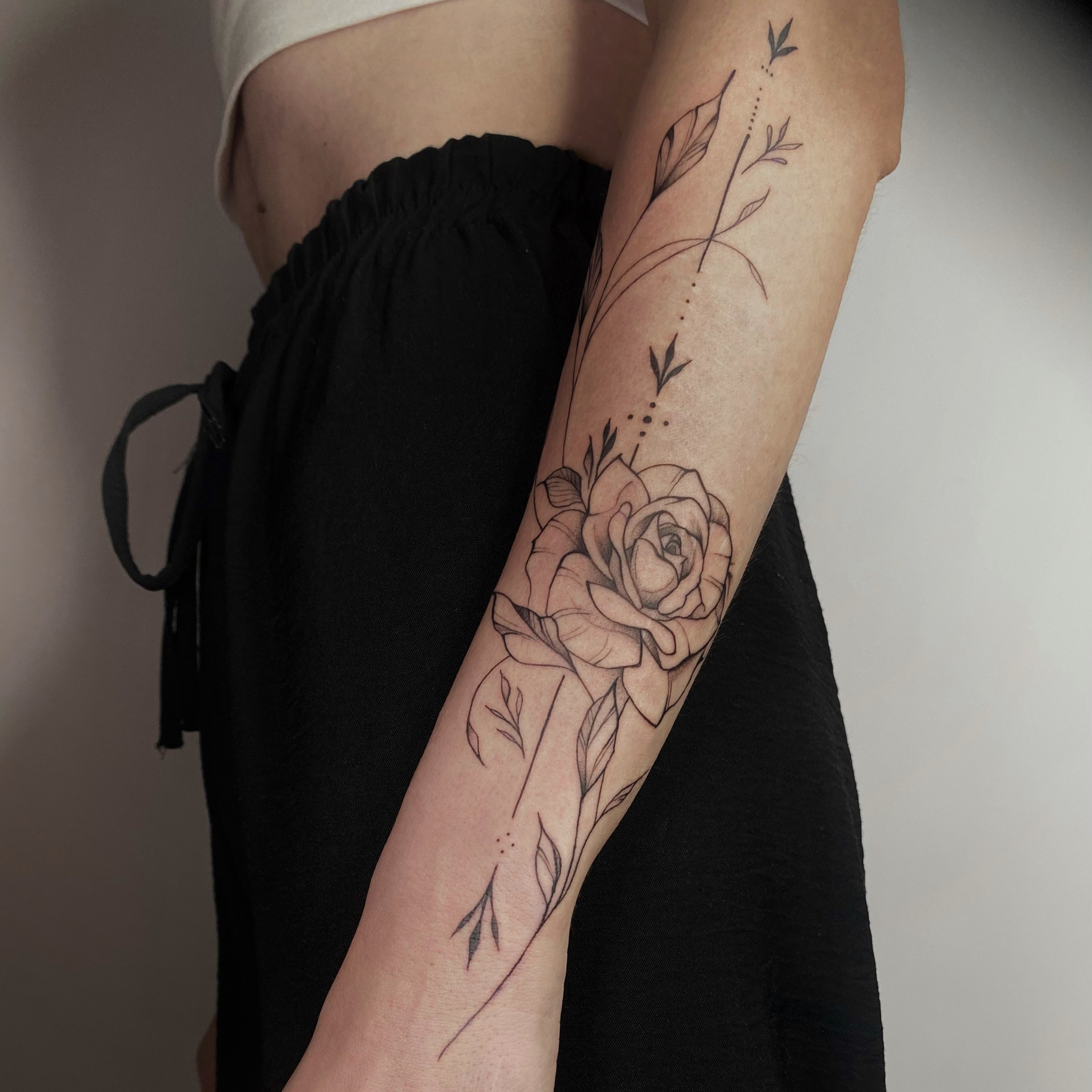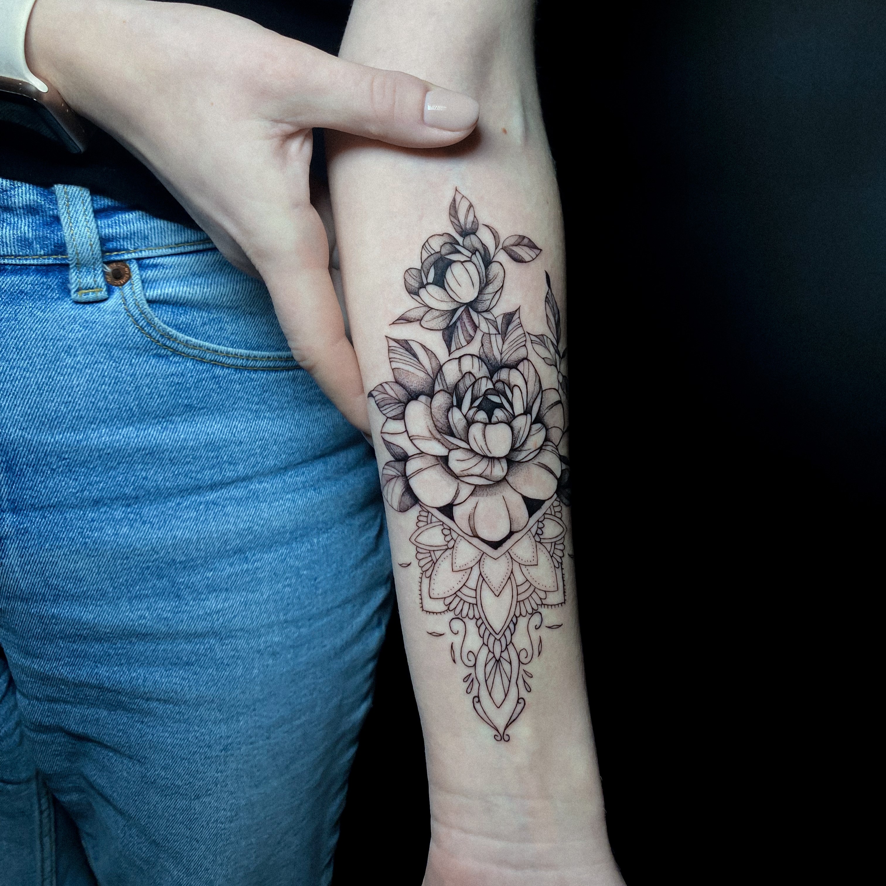 Сложное тату, татуировка большого размера от мастера перманентного макияжа и татуировки Анны Лантратовой.
