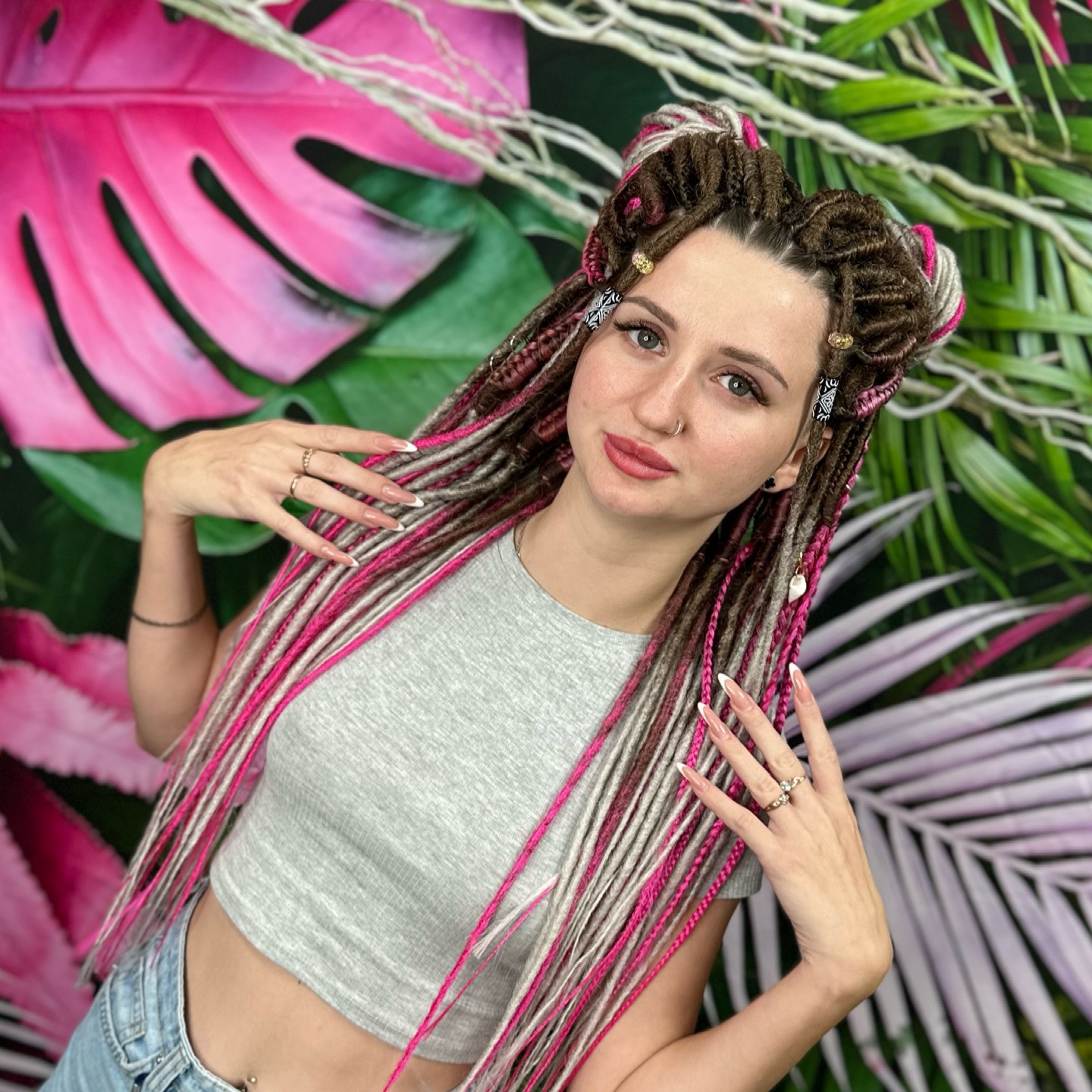 Вы можете выбрать любой цвет, фактуру и длину. Комплект может быть МОНО ( состоящим только из одного вида дред), а можно сделать микс – разные фактуры и цвета, добавить кос и украшений.