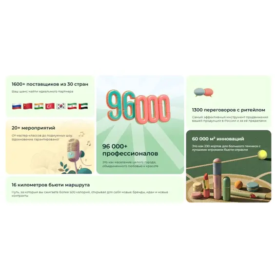 5) Посетителям мероприятие позволяет ознакомиться с новинками косметики, парфюмерии и оборудования, получить подарки, сэмплы, поучаствовать в розыгрышах и викторинах.