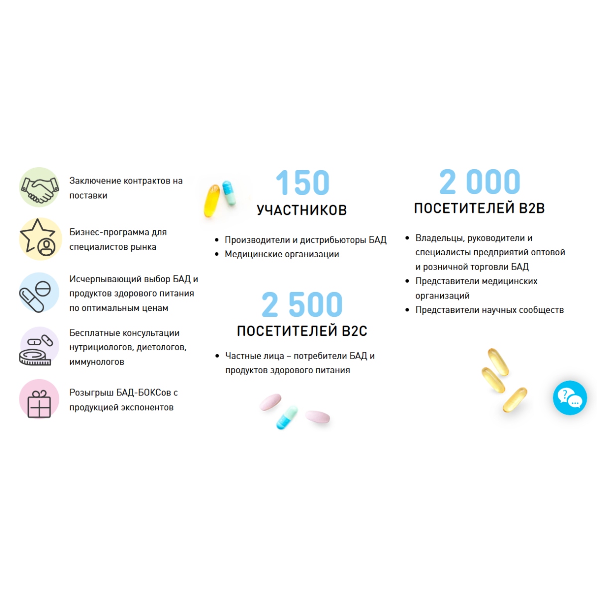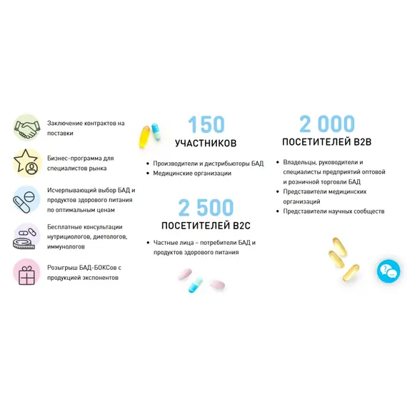 - 2000 посетителей В2В (Владельцы, руководители и специалисты предприятий оптовой и розничной торговли БАД, Представители медицинских организаций, Представители научных сообществ);