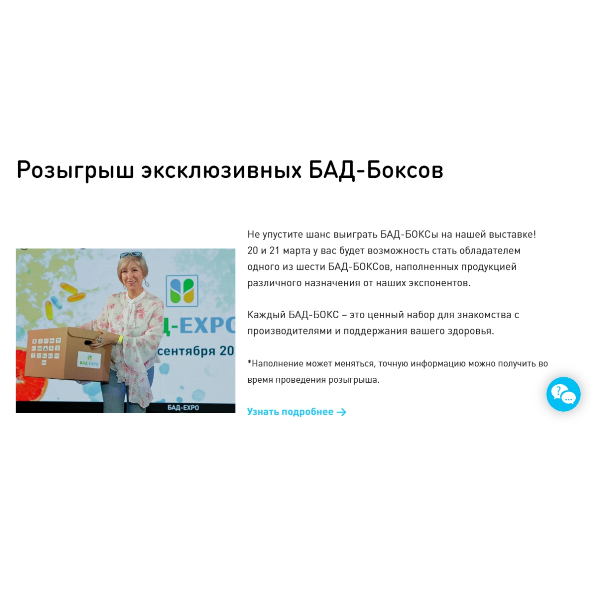 20 и 21 марта у вас будет возможность стать обладателем одного из шести БАД-БОКСов, наполненных продукцией различного назначения от наших экспонентов.